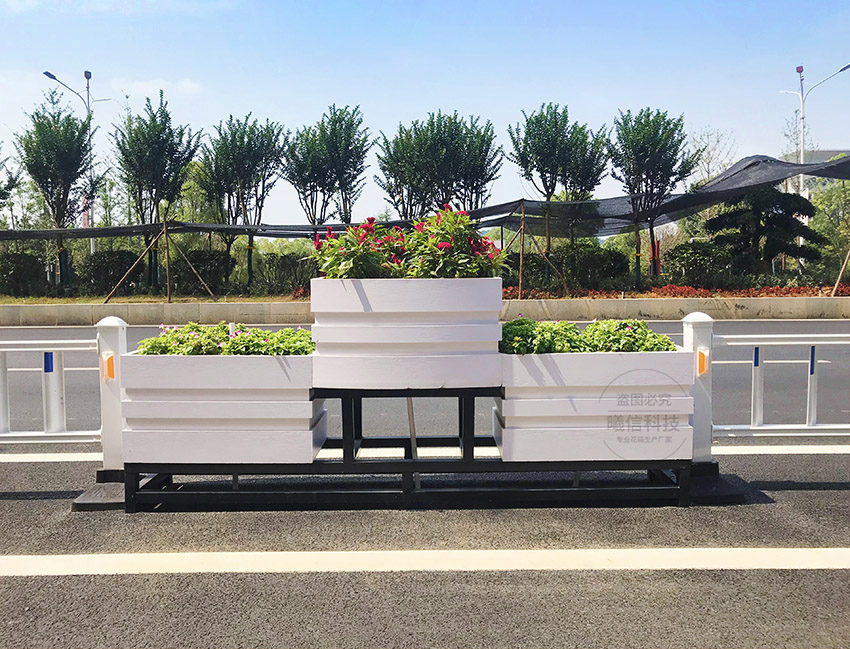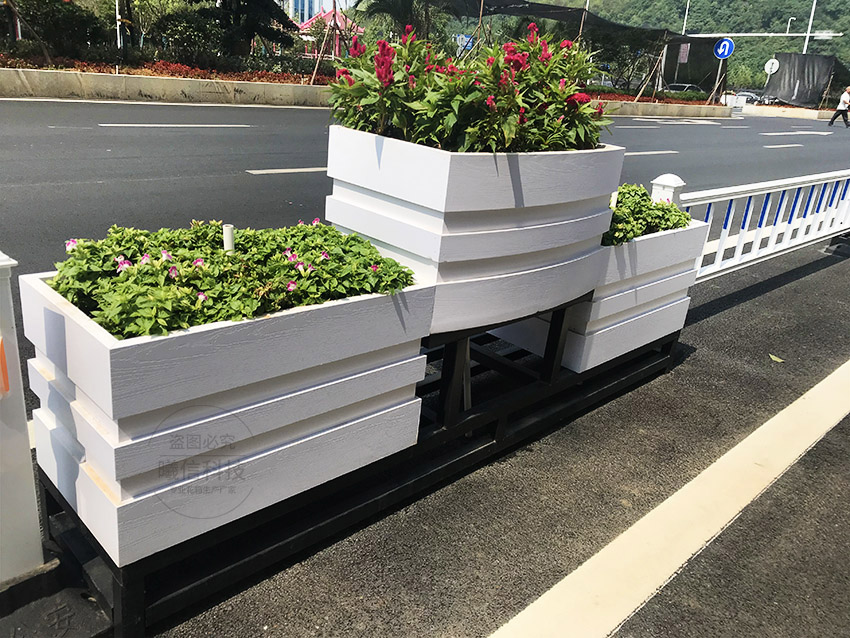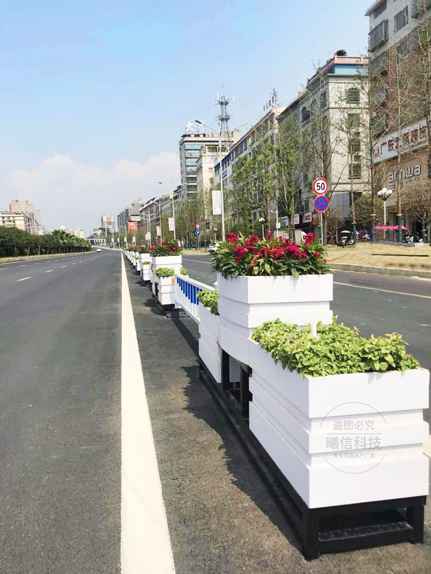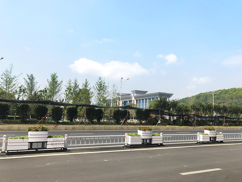 道路上的隔離花箱可選花箱護欄,花箱與護欄結(jié)合,滿足戶外市政使用需求:耐用、免維護、美觀。